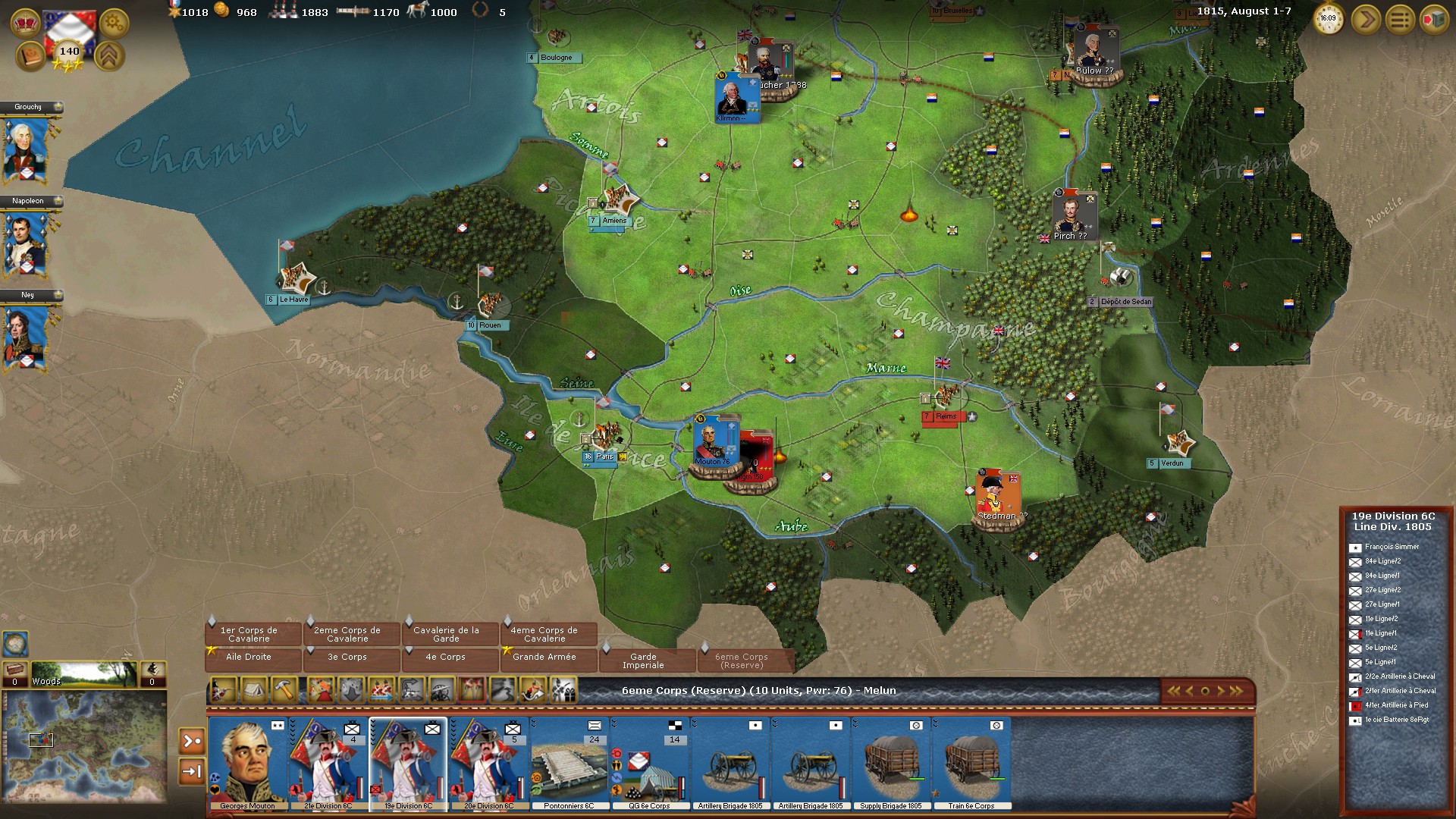 5) Tengo todo el ejército francés reunido en Mons. A los ingleses los he derrotado y parecen que han retrocedido. Los prusianos (Blucher) están dos regiones al este, en Charleville-Mezieres. Dispongo que todo el ejército francés mueva al oeste, hacia Lille, y termino el turno. Durante la Fase de Resolución se ven cómo mis unidades mueven hacia Lille. De repente aparece todo el ejército prusiano persiguiéndome, y entramos juntos en la región de Lille. Imagino que habrá una batalla allí. Pero no, sino que al terminar la Fase sus apilamientos están al sureste, en los alrededores de Sedán, mucho más alejados de mí ¿Por qué aparecen estas falsas imágenes? ¿Es una "falsa información" para despistar al jugador, o es un bug? Porque es imposible que en una semana hayan movido a Lille y luego marchado hasta Sedán. Dicho de otra manera, los apilamientos que están alejados más de 5 o 6 regiones ¿pueden ser falsos? ¿Puede el juego ofrecerte información falsa para despistarte?